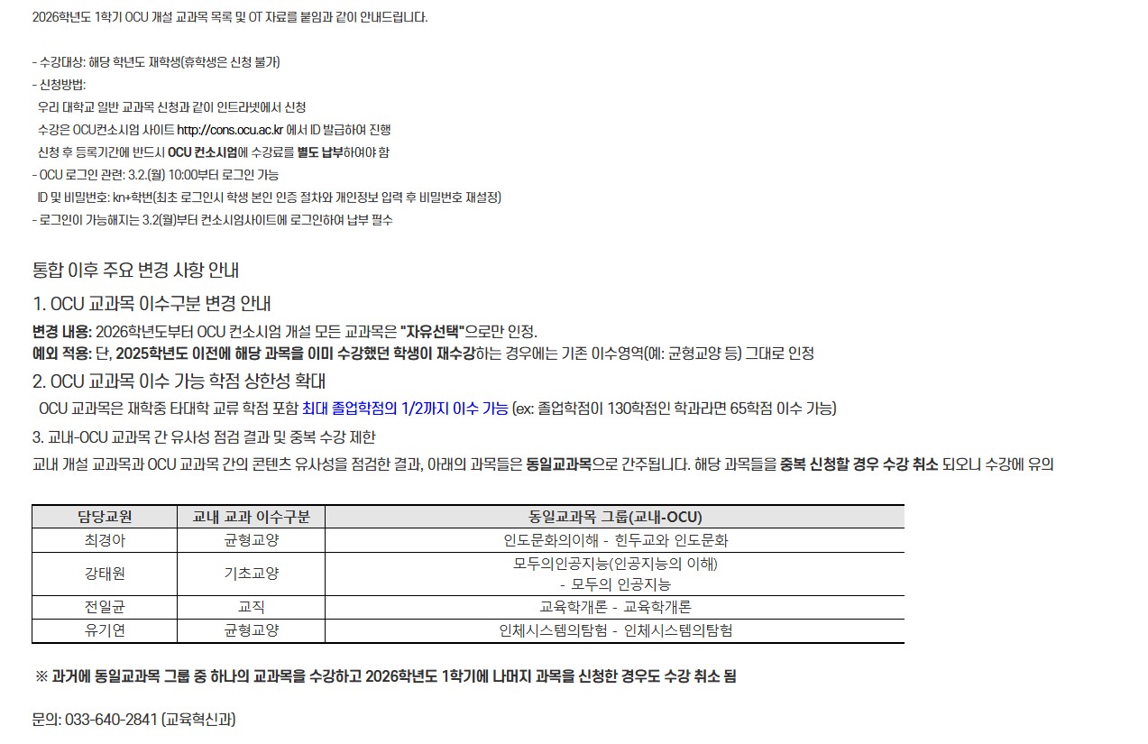 2026학년도 1학기 OCU개설교과목 및 통합 이후 주요 변경 사항 안내